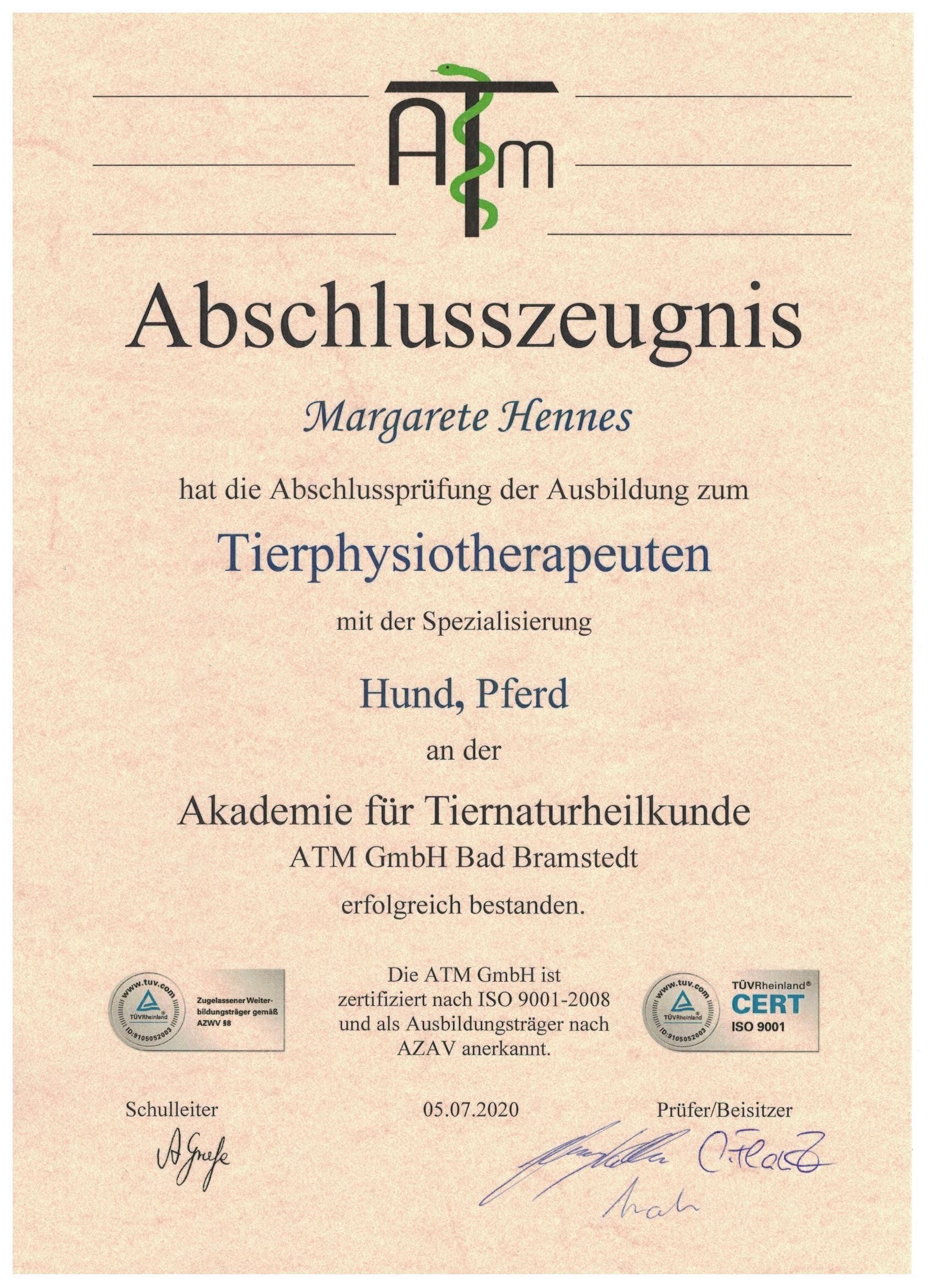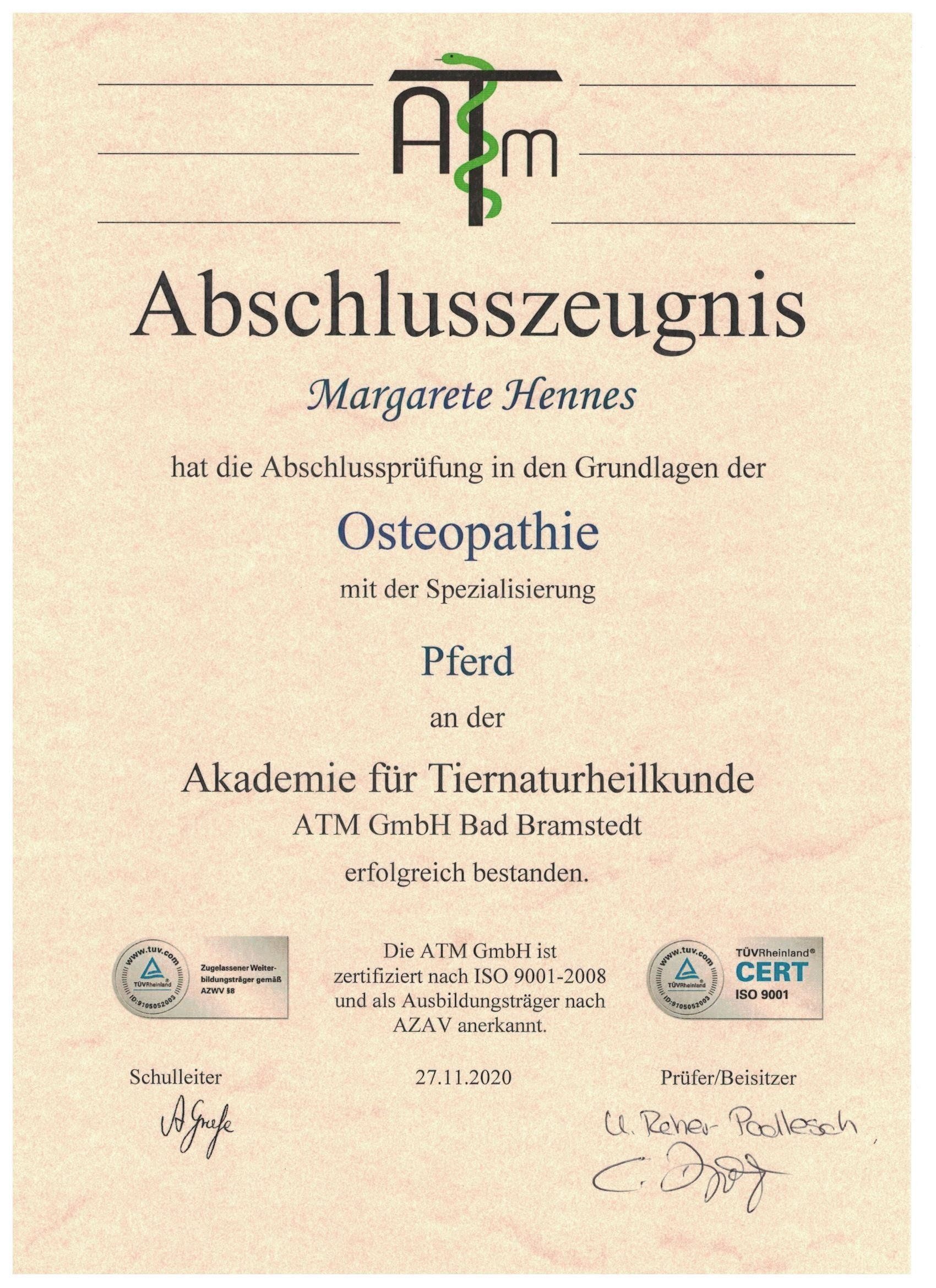 Also begann ich 2017 erneut mit einem berufsbegleitenden Studium und beschäftigte mich an der Akademie für Tiernaturheilkunde (ATM) intensiv mit alternativer Tiermedizin in Verbindung mit der Ausbildung zur Physiotherapeutin und Osteopathin für Pferd, Hund und Katze.
